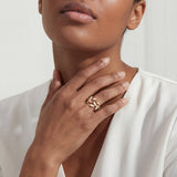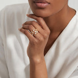 Su diseño inspirado en una hoja envuelve tu dedo con suavidad, mientras el ópalo blanco capta la luz y revela reflejos sutiles y fascinantes. Ligero y ajustable, se adapta a ti como si estuviera hecho a medida.